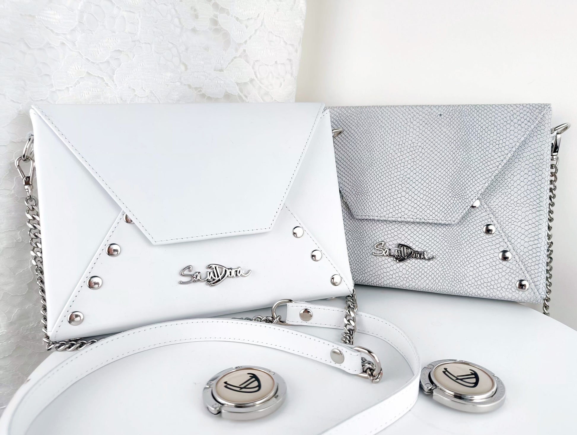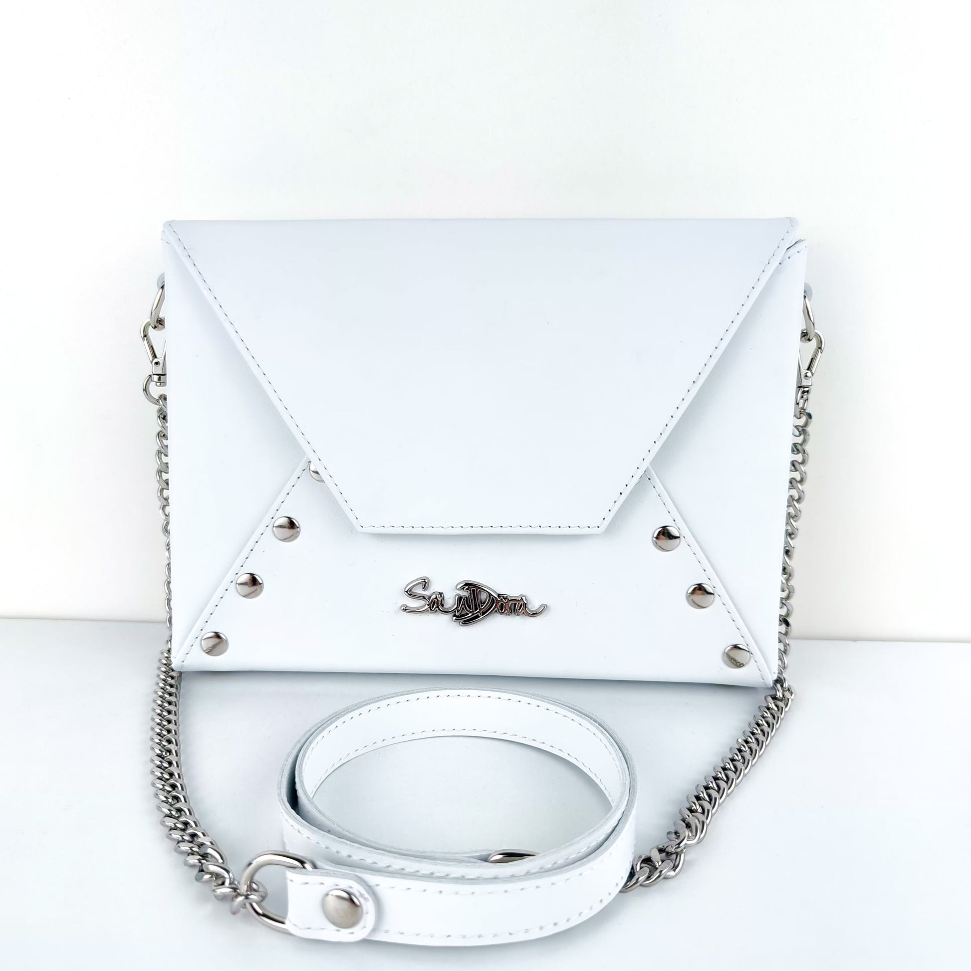 Step into your special moment with this handcrafted white leather envelope bag, where crisp minimalism meets timeless elegance.
