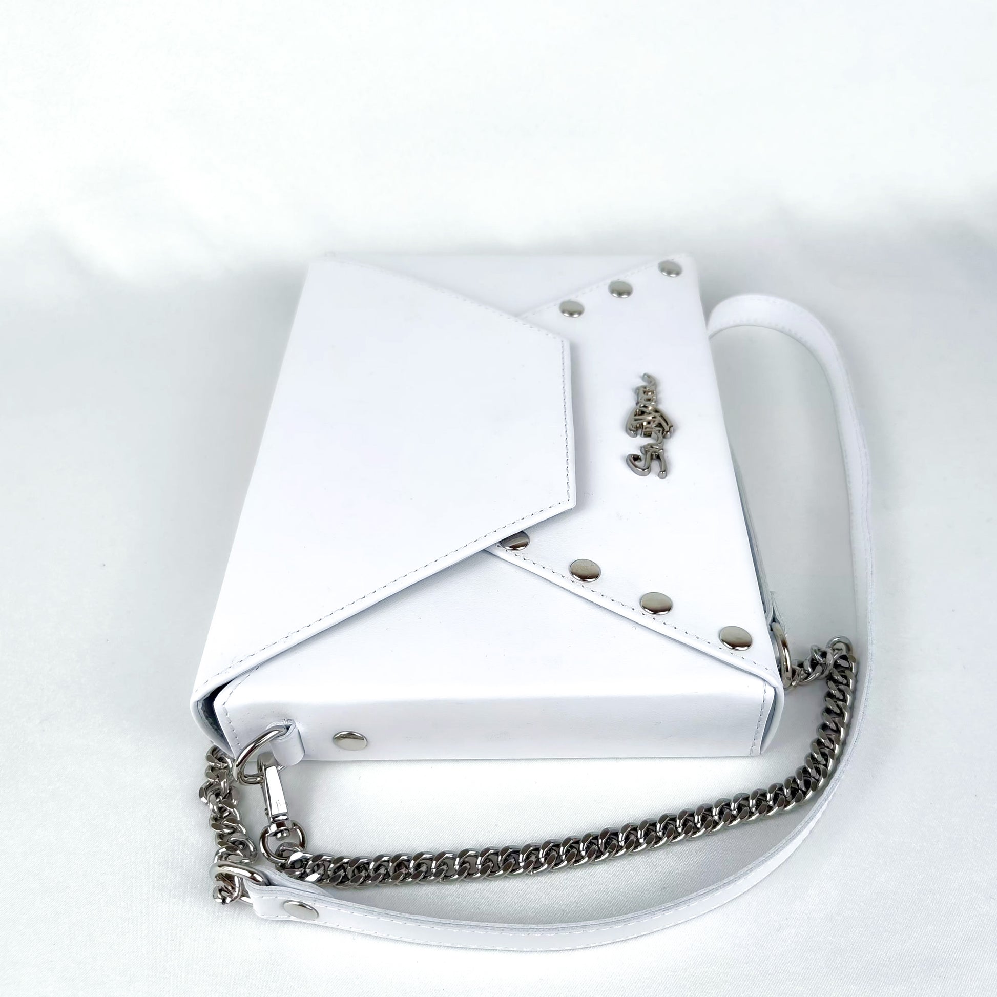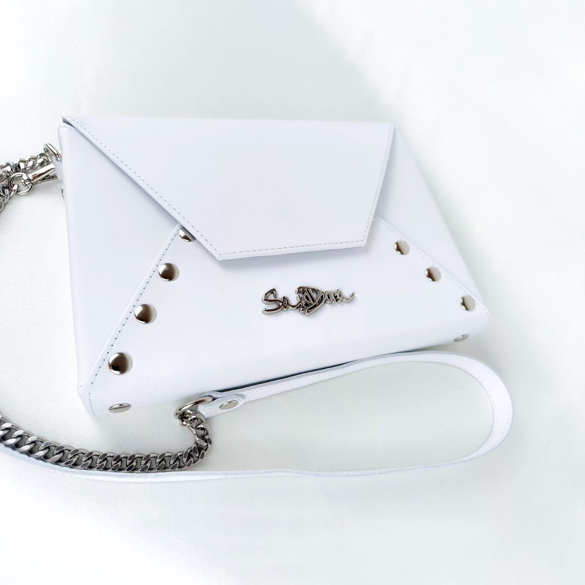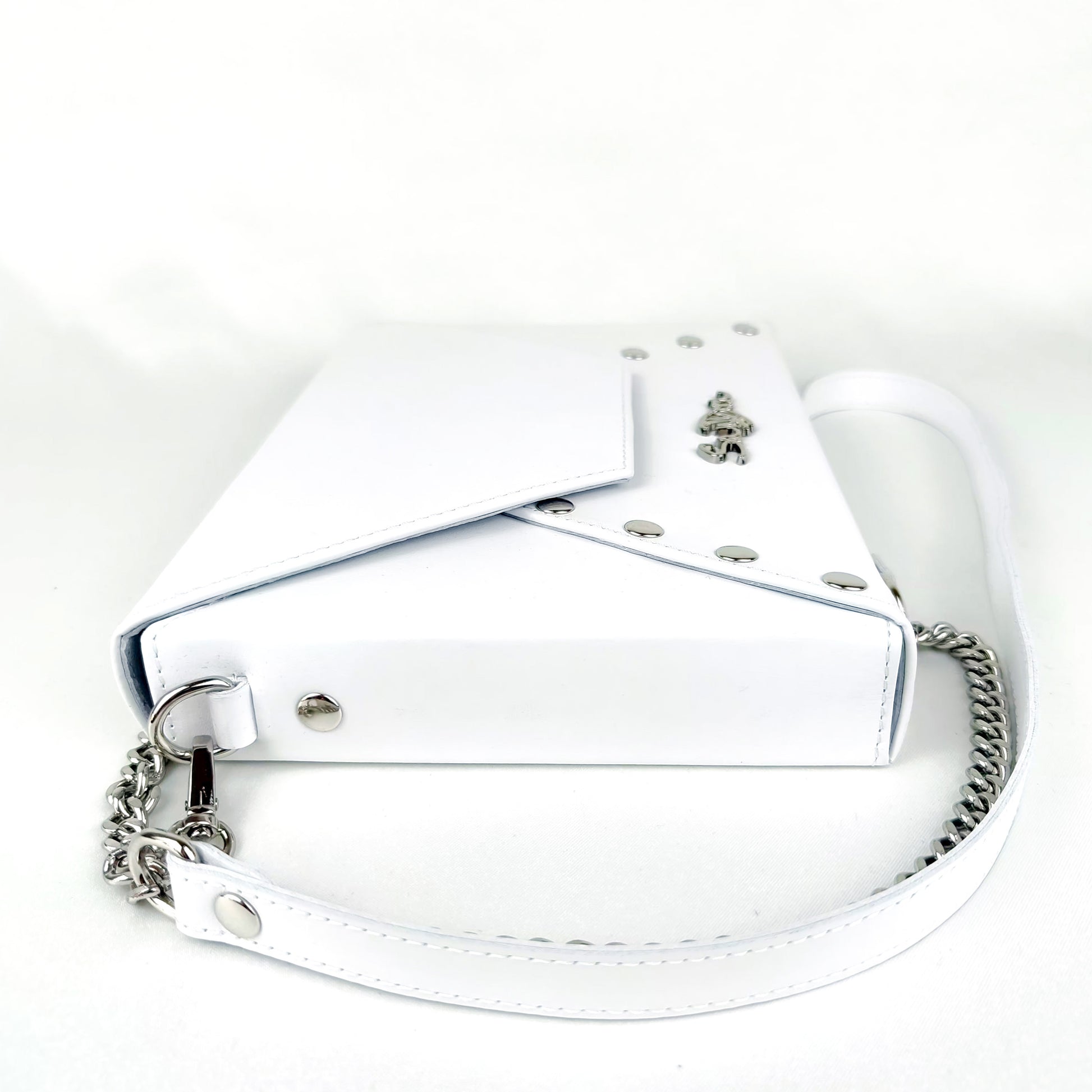 The smooth white leather radiates refined simplicity, while polished studs and a silver chain strap bring subtle contrast to the bridal-inspired design.