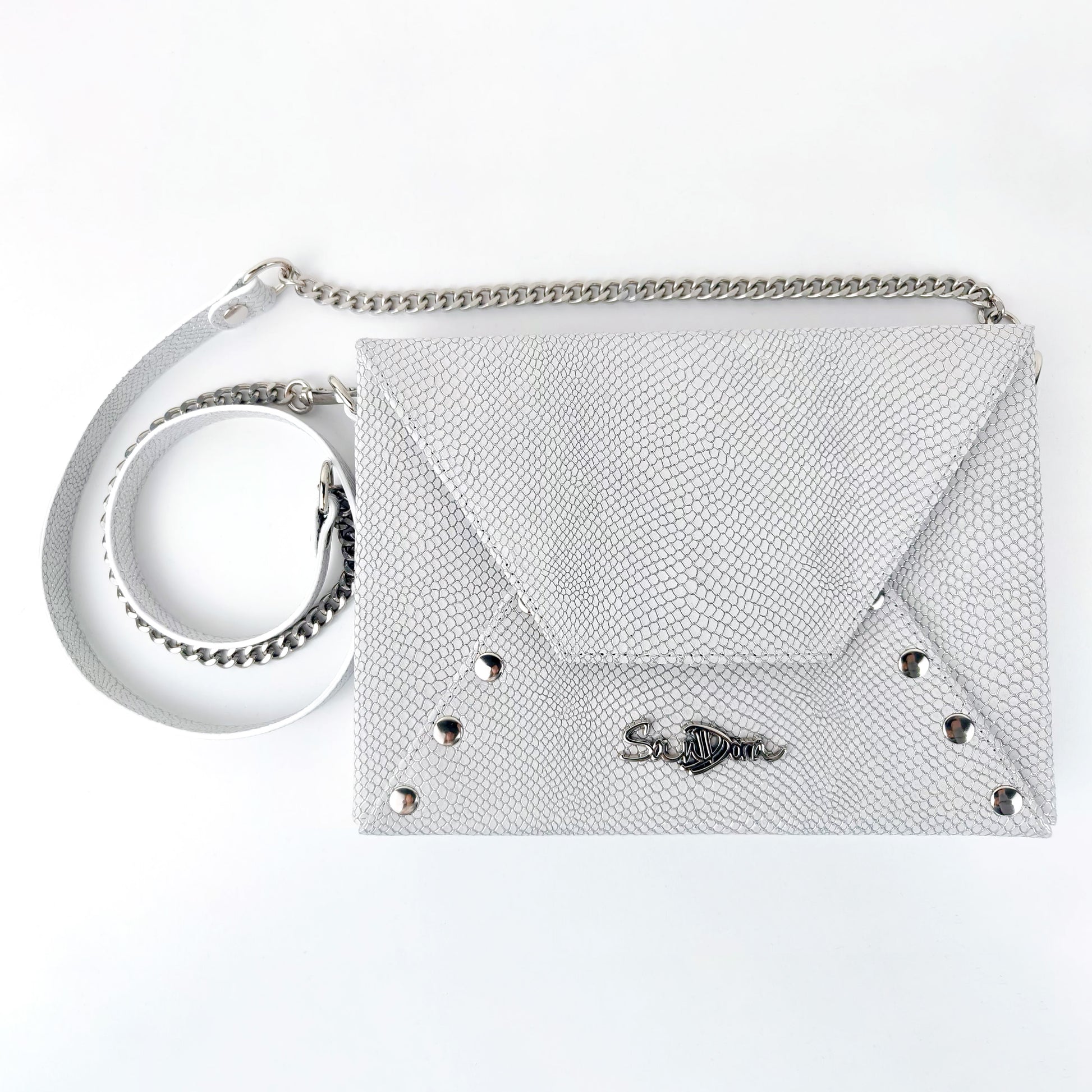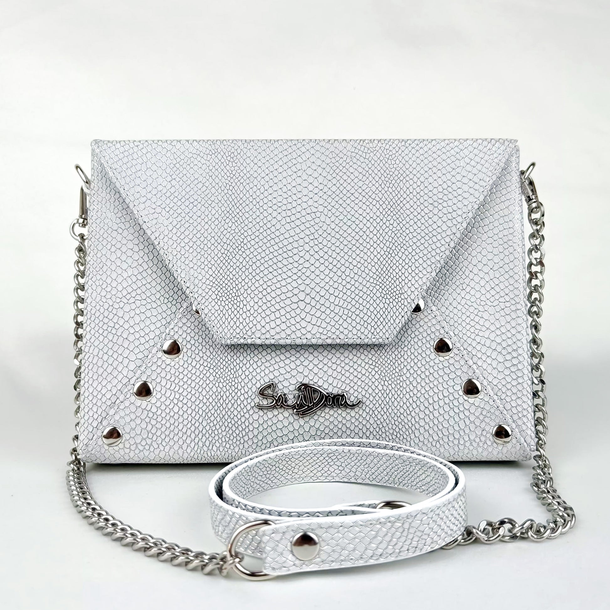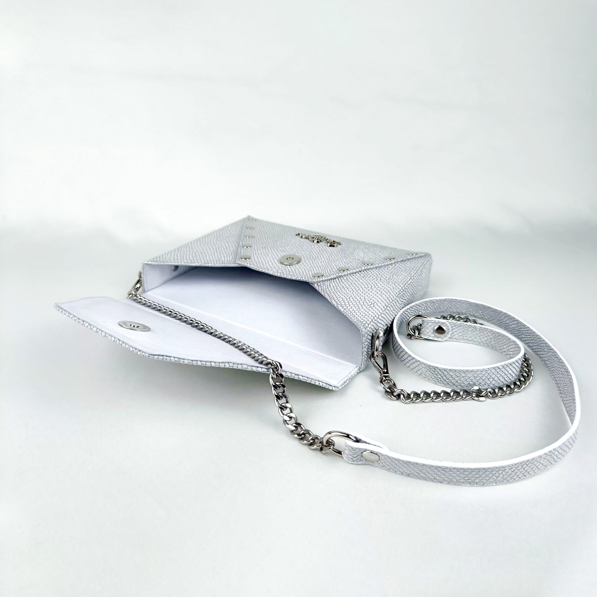 The snakeskin-textured leather catches the light beautifully, while polished studs and a silver chain strap add bold contrast to the refined bridal look.
