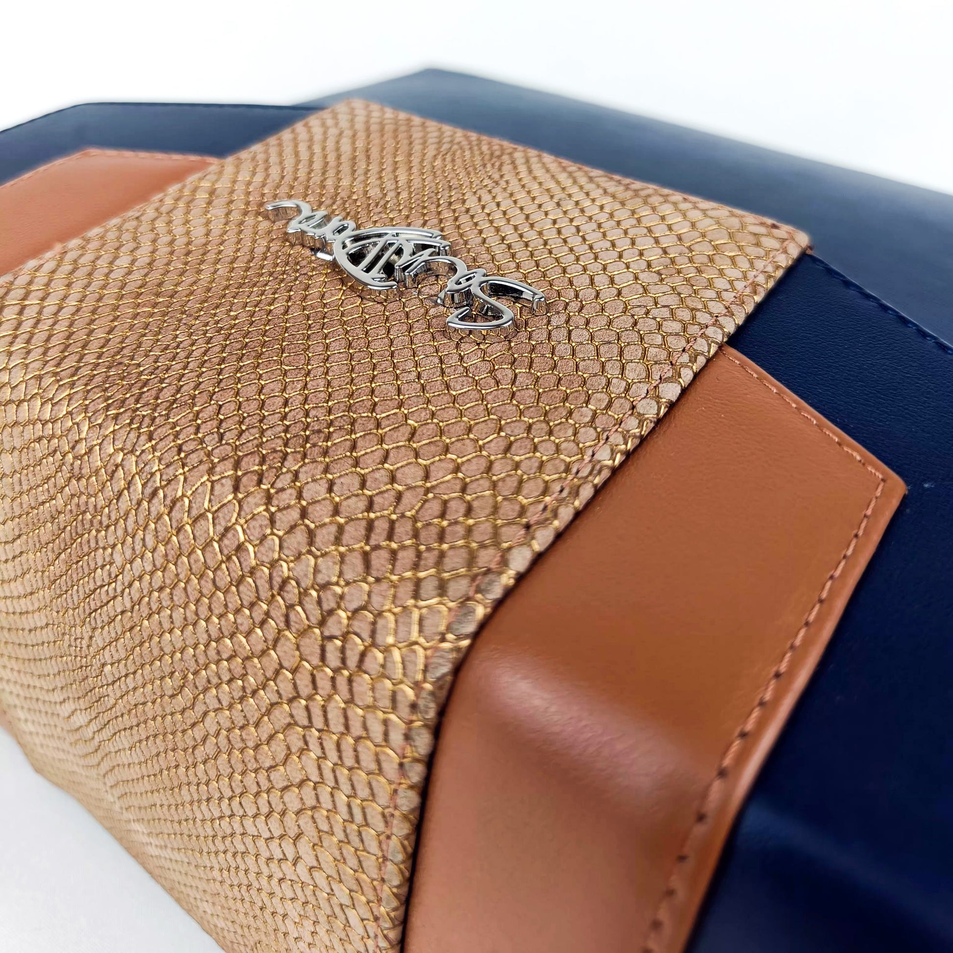 Turn heads with this handcrafted leather shoulder bag in deep navy, elevated with cognac accents and a shimmering gold snakeskin-textured flap.