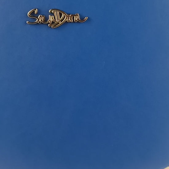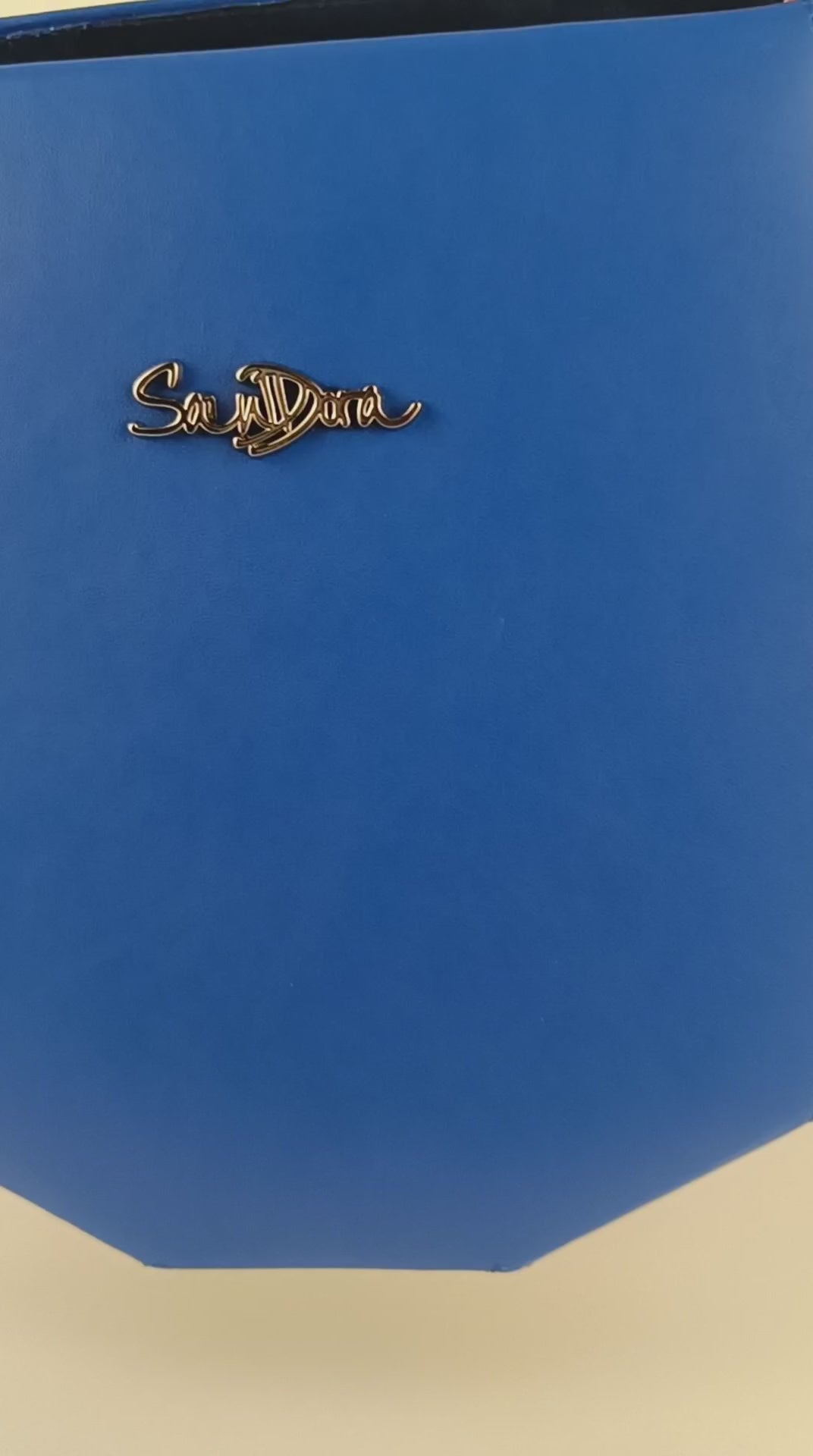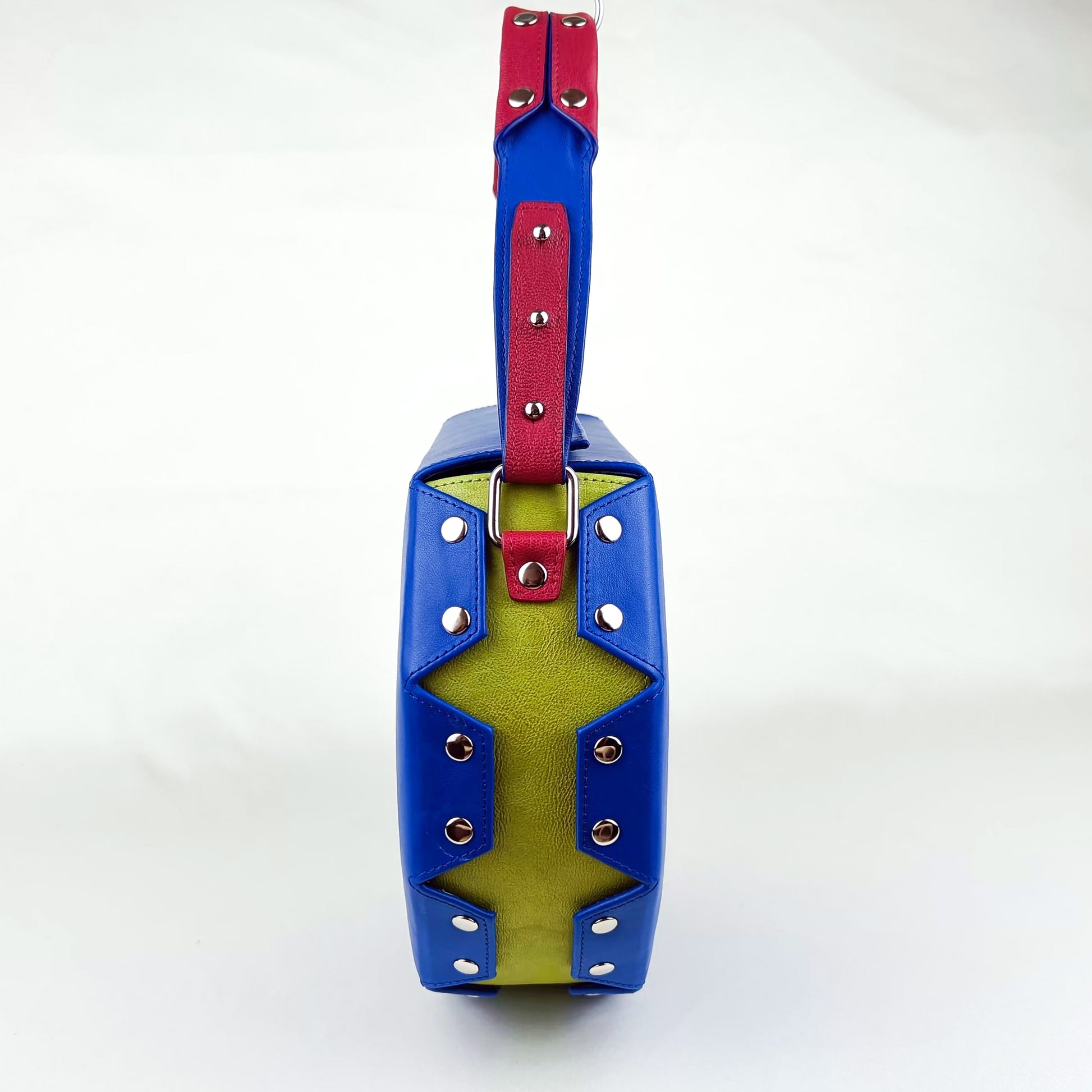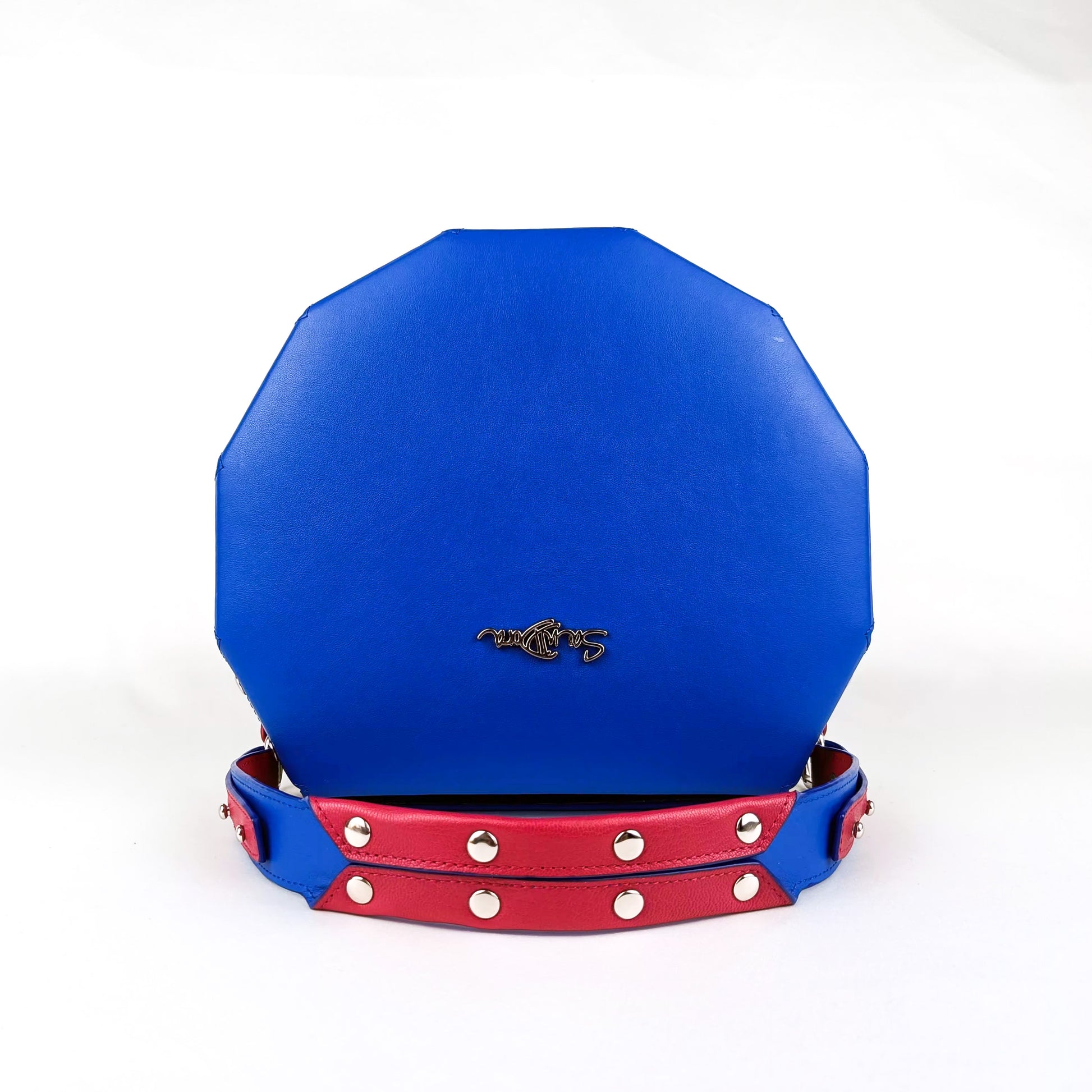 Turn heads with this exclusive leather clutch in bold royal blue. Its structured octagon shape, deep red studded handle, and mustard green accents make it a striking companion for both everyday elegance and standout events.