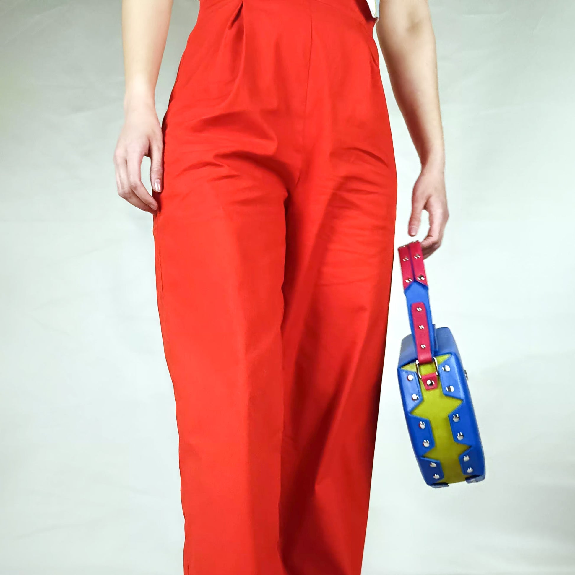 ✔ Studded deep red leather handle – bold and comfortable, designed to be carried by hand or snug under the arm.