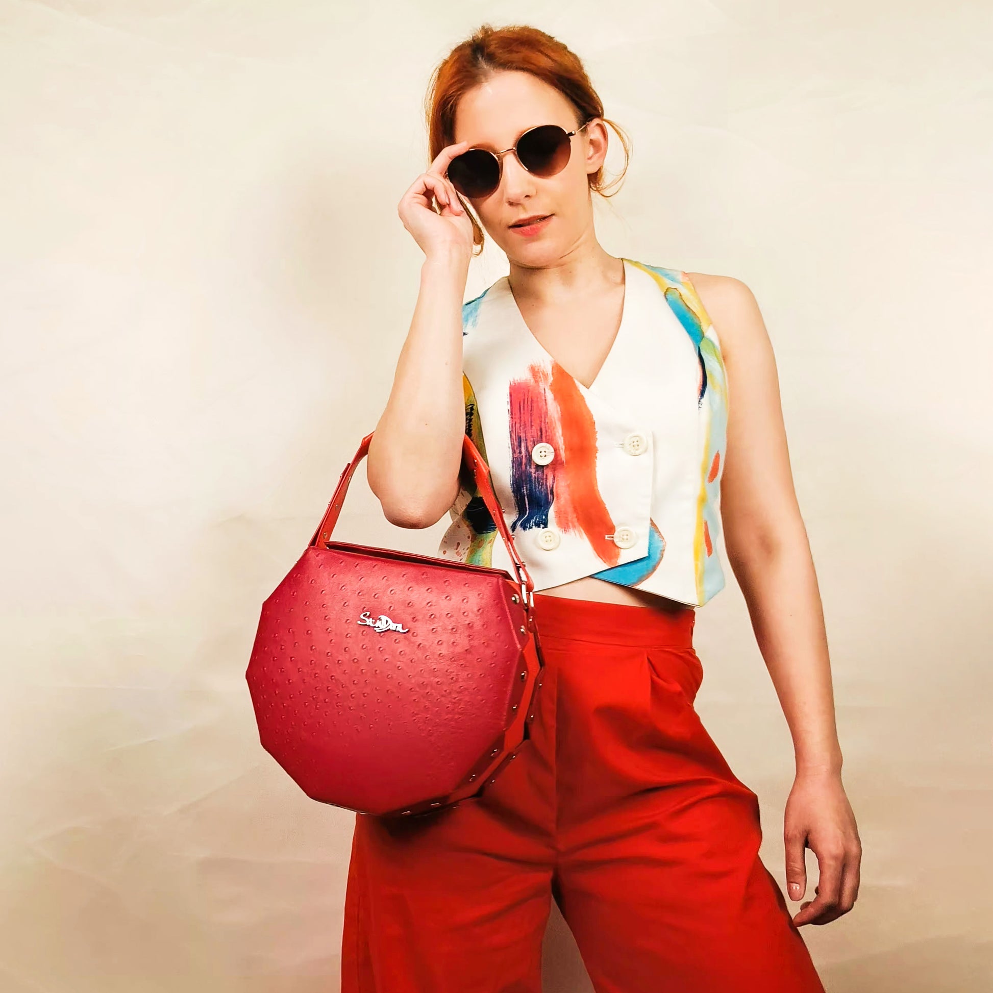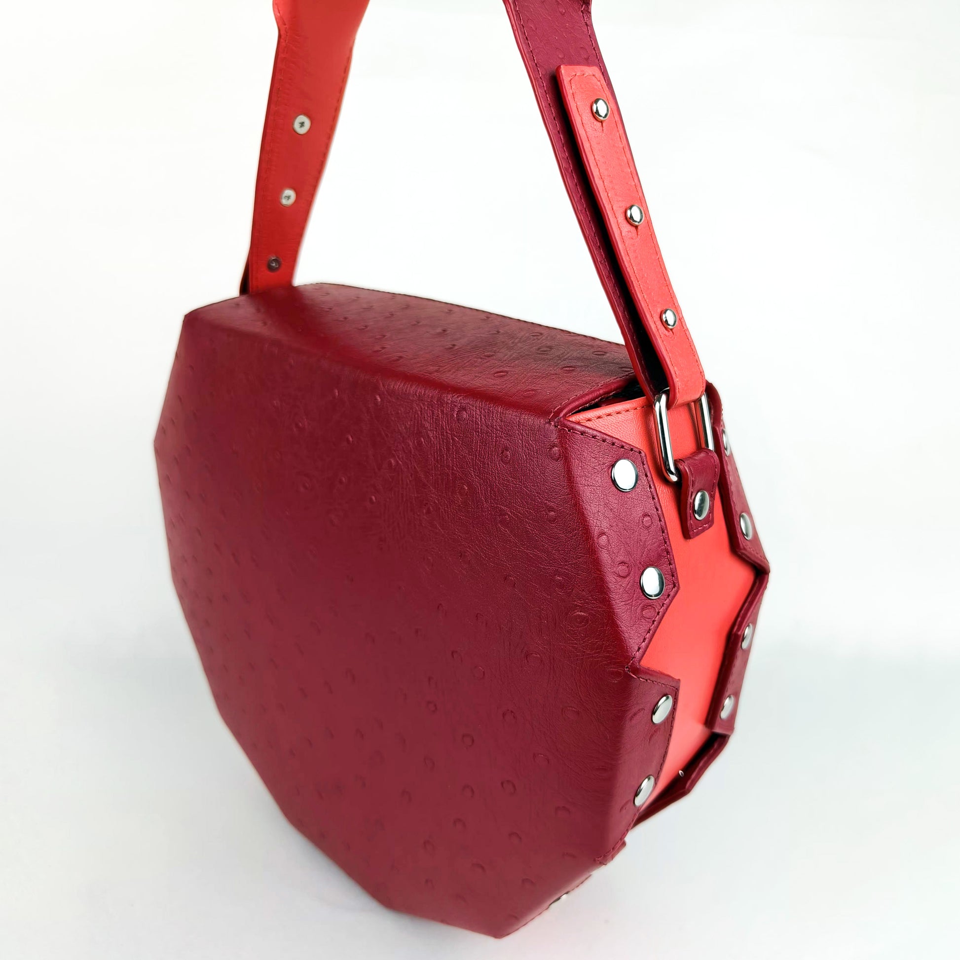 Turn heads with this exclusive leather clutch in vibrant berry red. Its structured octagon shape, bold studded handle, and coral red side panels make it a striking companion for both everyday elegance and standout events.
